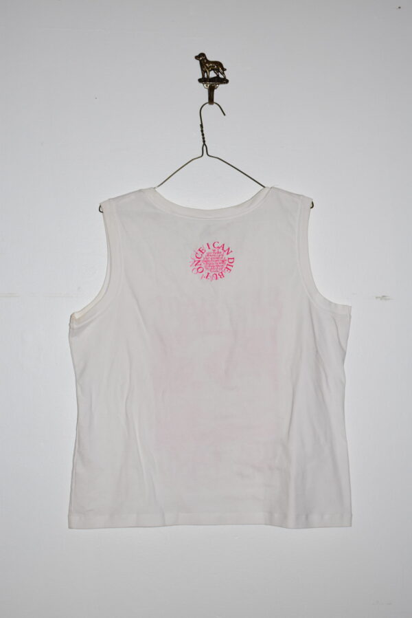 BITE HARD RUN FAST // I CAN DIE BUT ONCE // 21.5 inches pit-to-pit. Pink ink on white shirt.